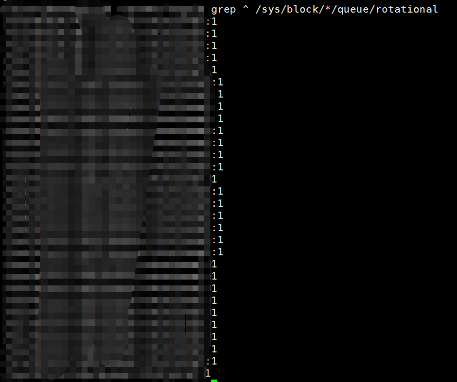 然后继续询问google,google告诉我可以通过grep查看所有的盘,就是他:grep ^ /sys/block/*/queue/rotational。这个命令的结果吓我一跳,怎么会有这么多盘啊,我瞬间觉得不靠谱,这不是我想要的。这个也pass了。