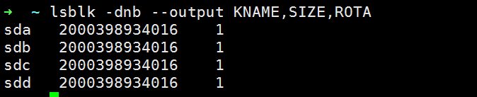 这里面有一个重要指标,ROTA,rotational device, 可旋转磁盘标志位,可用于区分 HDD 盘和 SSD 盘: 0 - 不可旋转,SSD; 1 - 可旋转,HDD。好了,到这里,我们已经找到了我们想要的,对这个命令进行精简,最后得到我们想要的。lsblk -dnb --output KNAME,SIZE,ROTA