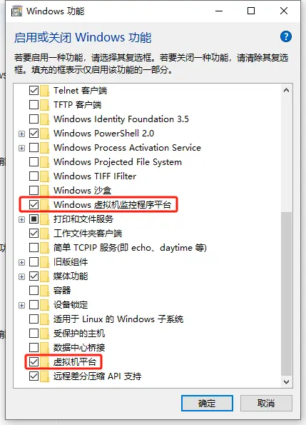 打开启用或关闭Windows功能->勾选打开以下两项 重启