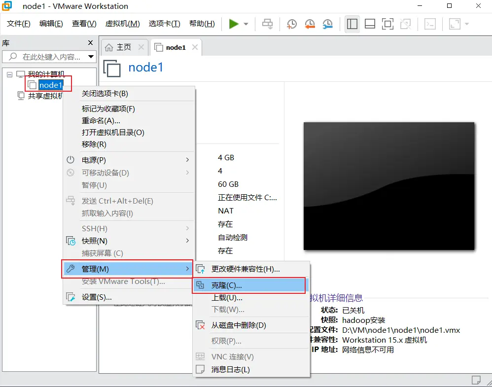 关闭虚拟机对node1进行克隆