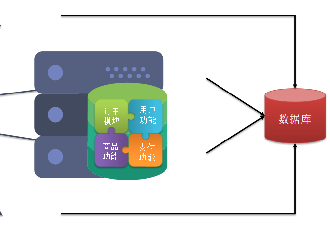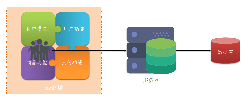 但是它也有一个致命的缺陷,即每个业务功能之间的耦合度太高,如果其中一个业务的功能出现问题,那么整个项目都得停下进行维护,不然项目运行就会发生崩溃或者异常,具体的单体架构示意图如图1.1所示。