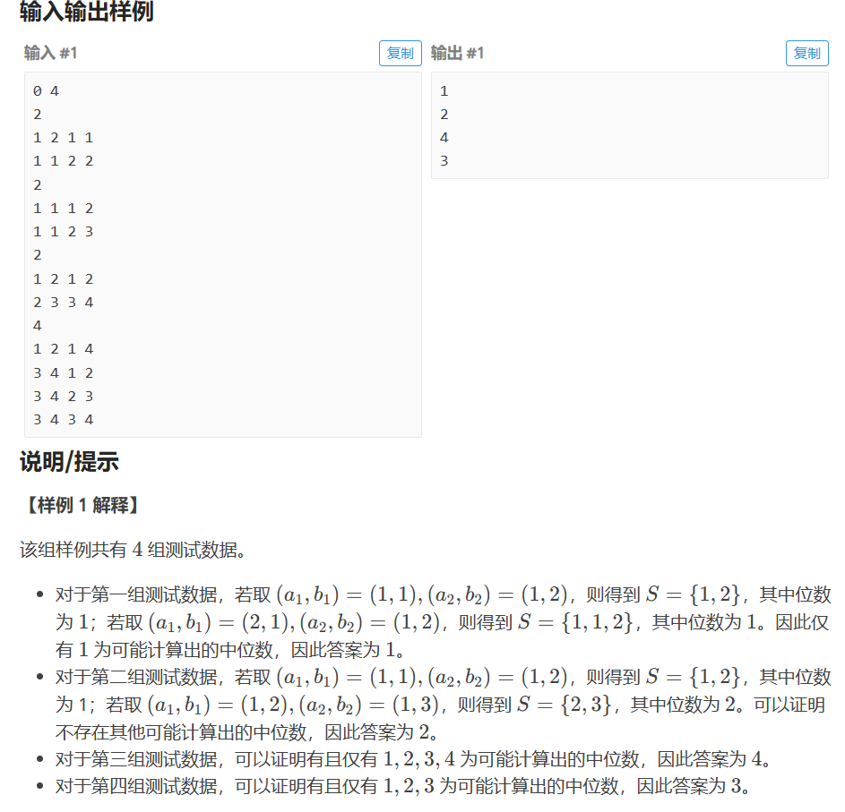 然后刚写完暴力,哦,正解会了,注意到可以作为中位数的数一定是一个连续区间除去不可能出现的数,于是分别二分这个区间的左右端点,直接贪心 check 即可,然后就是离散化,找出这个区间内所有可能出现的数。然后又过了 \(1h\) 过掉了所有大样例。
