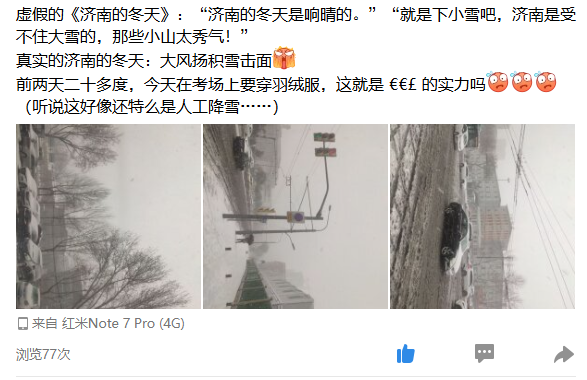 具体的雪景就懒得黏了,见怪不怪了,吐槽一下济南的铲雪技术,甚至还要推车,路跟个巧克力雪糕一样