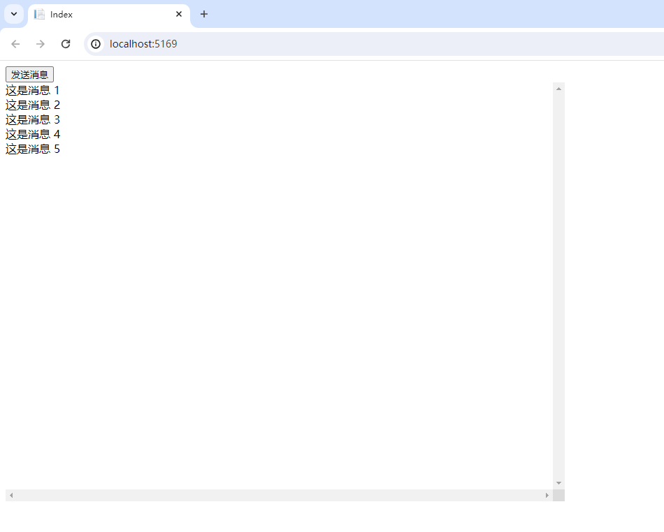 @{ Layout = null; } <!DOCTYPE html> <html> <head> <meta name="viewport" content="width=device-width" /> <title>Index</title> <script> function ReceiveEvent() { const source = new EventSource('@Url.Action("EventSource")'); source.onmessage = function (event) { if (event.data != '[stream-end]') { if (event.data) { document.getElementById('content').innerHTML += event.data + '<br/>'; } else { document.getElementById('content').innerHTML += '<br/>'; } } else { source.close(); console.log('请求结束'); } } } </script> </head> <body> <div> <button id="btnSend" onclick="ReceiveEvent()" >发送消息</button> </div> <div id="content" style="width:800px;height:600px;overflow:scroll;"> </div> </body> </html>