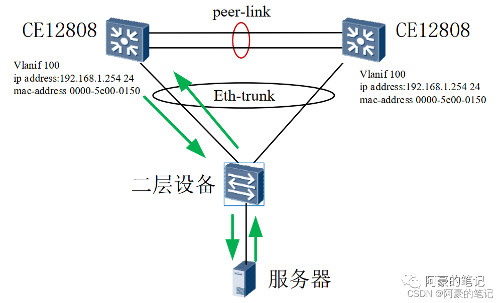 当由服务器向网关发起 ping 测试时,数据流走向如下图所示,到达二层交换机后,由 HASH 算法确定数据帧通过左侧的 eth-trunk 成员链路转发至CE12808 设备。当左侧 CE12808 设备收到数据帧后, 根据目的 MAC 地址确定是发给自己的报文, 然后拆掉二层帧头并将内部的 IP 数据包交给 IP 协议处理, 再从相同的路径回包给服务器, 实现服务器与网关的互访。同理, 从左侧 CE12808设备向服务器 ping 测试时, 数据流向通过同样的链路进行交互。