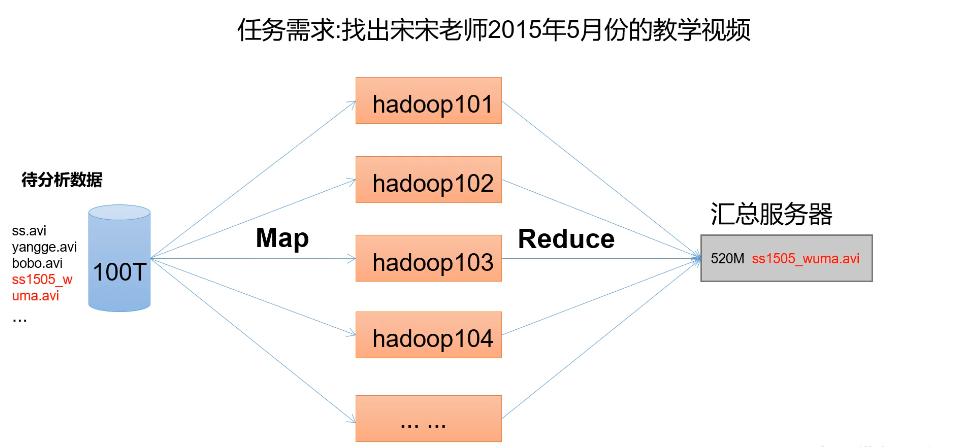 HDFS将海量数据(例如100TB)分割成多个小块,并将这些数据块分散存储在多个节点中。若是某个客户端需要从n个节点中读取所需要的数据,MapReduce将任务分派给每个node(Map),每个node查询的结果汇总(Reduce)。