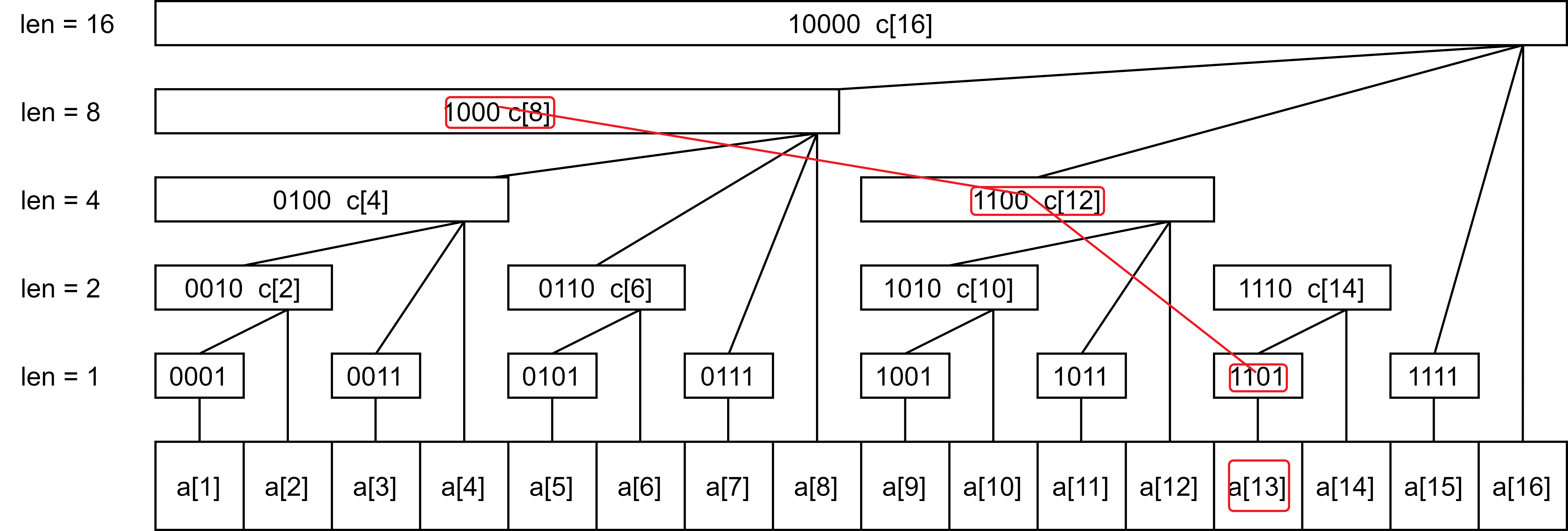 如果我们想逼近一个点,其前缀和为 \(k\),我们可以按照上图红线的方式逼近(假设最后 \(a_{13}\) 前缀和为 \(k\))。