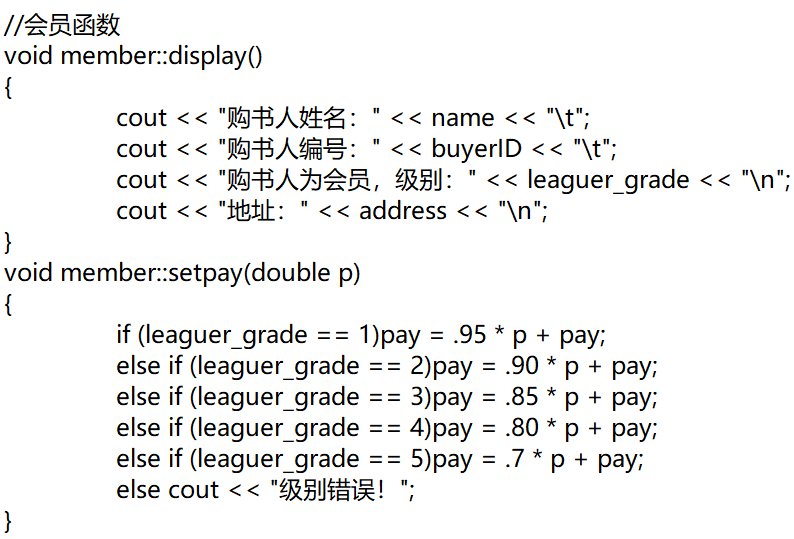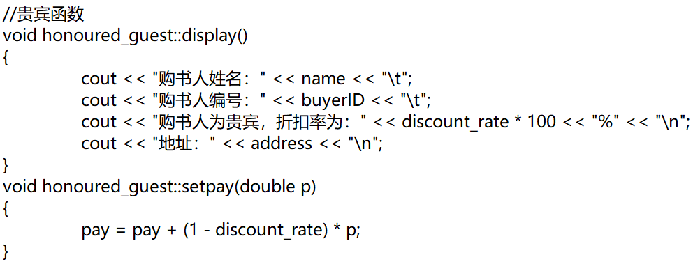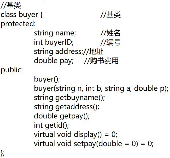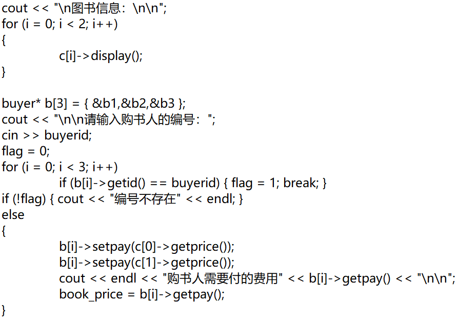 基类和图书类都含有返回基础数据和显示数据的功能,主函数的代码部分主要将购书用户及书本信息从文件中读取,再将订单信息写入至文件,