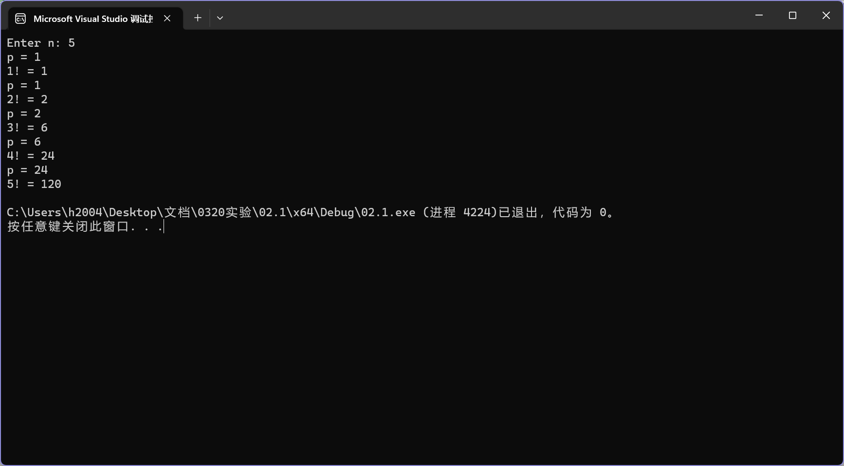 // 利用局部static变量的特性,计算阶乘 #include <stdio.h> long long fac(int n); // 函数声明 int main() { int i, n; printf("Enter n: "); scanf_s("%d", &n); for (i = 1; i <= n; ++i) printf("%d! = %lld\n", i, fac(i)); return 0; } // 函数定义 long long fac(int n) { static long long p = 1; printf("p = %lld\n", p); p = p * n; return p; }