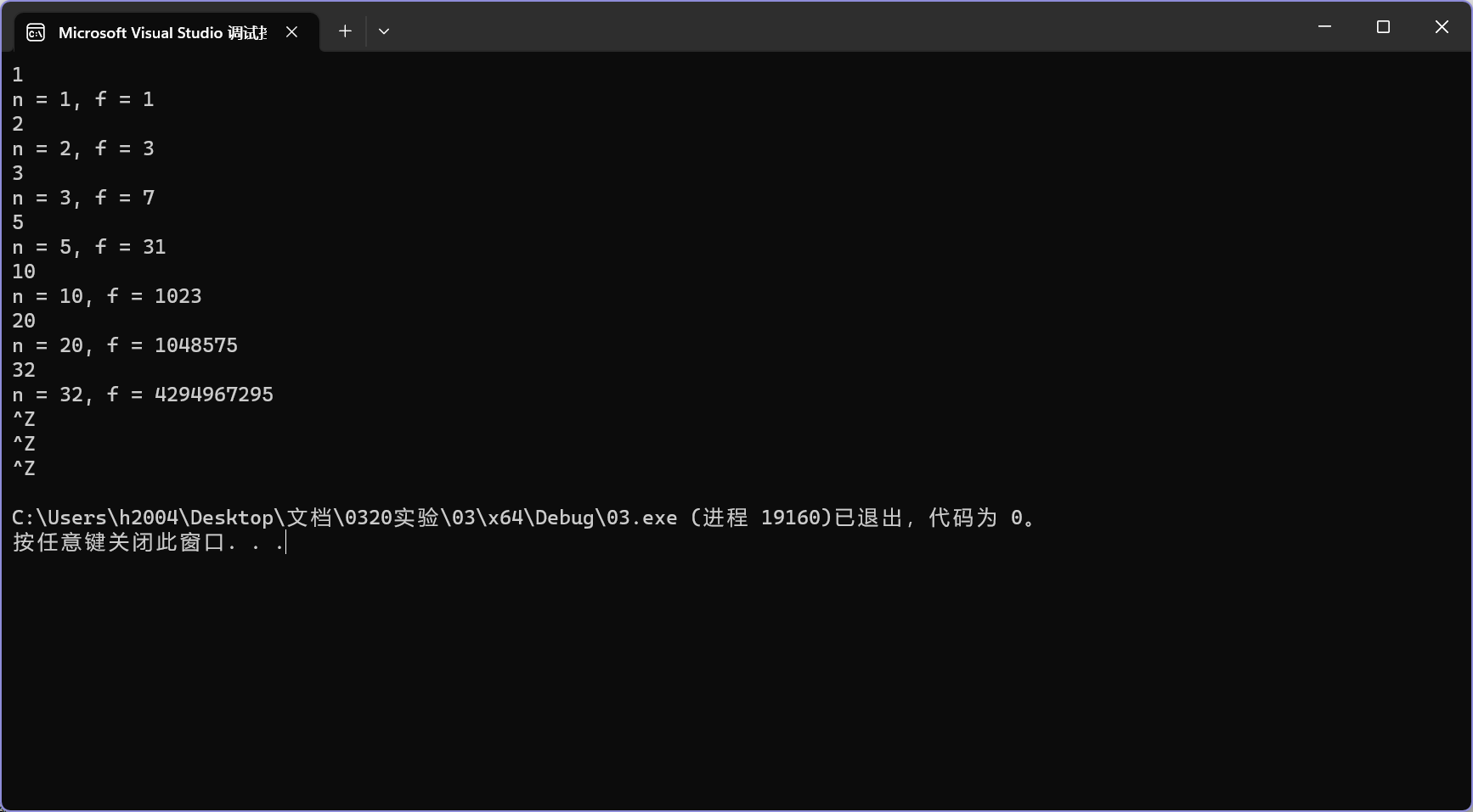 1 #include <stdio.h> 2 long long func(int n); // 函数声明 3 int main() { 4 int n; 5 long long f; 6 while (scanf_s("%d", &n) != EOF) { 7 f = func(n); // 函数调用 8 printf("n = %d, f = %lld\n", n, f); 9 } 10 return 0; 11 } 12 long long func(int n) 13 { 14 long long sum = 1; 15 for (int i = 1; i <= n; i++) 16 { 17 sum = 2*sum; 18 } 19 return sum - 1; 20 }