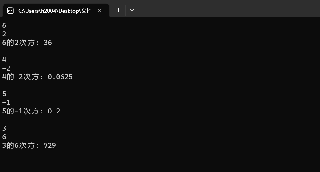 1 #include <stdio.h> 2 double mypow(int x, int y); // 函数声明 3 int main() { 4 int x, y; 5 double ans; 6 while (scanf_s("%d%d", &x, &y) != EOF) { 7 ans = mypow(x, y); // 函数调用 8 printf("%d的%d次方: %g\n\n", x, y, ans); 9 } 10 return 0; 11 } 12 double mypow(int x, int y) 13 { 14 double ans = 1; 15 if (y == 0) 16 { 17 ans= 1; 18 } 19 else 20 { 21 if (y>0) 22 { 23 ans = x * mypow(x,y - 1); 24 } 25 else 26 { 27 ans = 1.0 / x /mypow(x,-y - 1); 28 } 29 } 30 return ans; 31 }