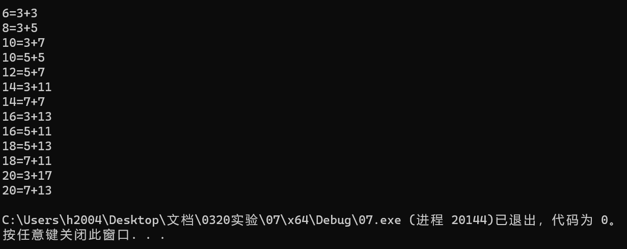 1 #include <stdio.h> 2 #include <math.h> 3 4 int is_prime(int n); //函数声明,判断素数 5 6 int main() 7 { 8 int even; 9 even = 1; 10 for (even = 1; even < 21; even++) 11 { 12 for (int i = 1; i <= even / 2; i += 2) 13 if (is_prime(i) && is_prime(even - i)) 14 printf("%d=%d+%d\n", even, i, even - i); 15 16 } 17 return 0; 18 } 19 20 // 判断素数,若是返回1,否则返回0 21 int is_prime(int n) 22 { 23 if (n == 1) 24 return 0; 25 int temp = (int)sqrt(n); 26 for (int i = 2; i <= temp; i++) 27 if (n % i == 0) 28 return 0; 29 return 1; 30 }