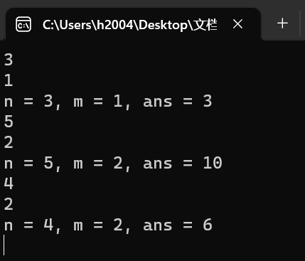 #include <stdio.h> int func(int n, int m); int main() { int n, m; while (scanf_s("%d%d", &n, &m) != EOF) printf("n = %d, m = %d, ans = %d\n", n, m, func(n, m)); return 0; } int func(int n, int m) { int ans; if (n < m) return 0; else if (n == m || m == 0) return 1; else { return func(n - 1, m - 1) + func(n - 1, m); } }