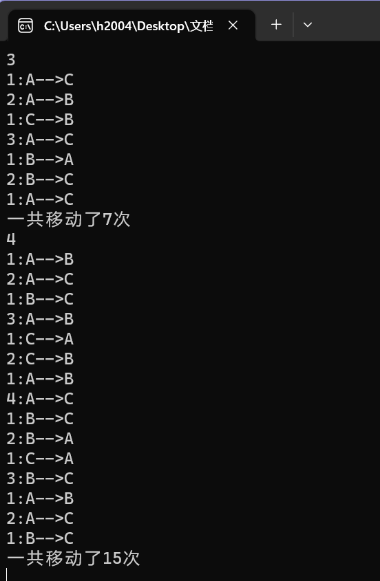 1 #include< stdio.h> 2 #include< stdlib.h> 3 void hanoi(unsigned int n, char from, char temp, char to); /*递归函数声明*/ 4 void moveplate(unsigned int n, char from, char to);/*移动函数的声明*/ 5 int i = 0; 6 int main() { 7 unsigned int n; 8 while (scanf_s("%u", &n) != EOF) 9 { 10 i = 0; 11 hanoi(n, 'A', 'B', 'C'); 12 printf("一共移动了%d次\n", i); 13 } 14 system("pause"); 15 return 0; 16 } 17 void hanoi(unsigned int n, char from, char temp, char to) 18 { 19 if (n == 1) 20 moveplate(n, from, to); 21 else 22 { 23 hanoi(n - 1, from, to, temp); /*n-1个盘子从A以C为中转移到B上*/ 24 moveplate(n, from, to);/*将盘子n从A移到C上*/ 25 hanoi(n - 1, temp, from, to);/*将 n-1个盘子从B以 A为中转移到 C上*/ 26 } 27 } 28 void moveplate(unsigned int n, char from, char to) 29 { 30 printf("%u:%c-->%c\n", n, from, to); 31 i =i+ 1; 32 }