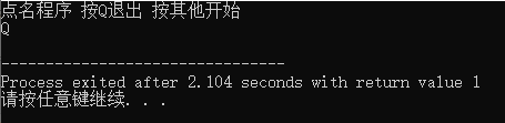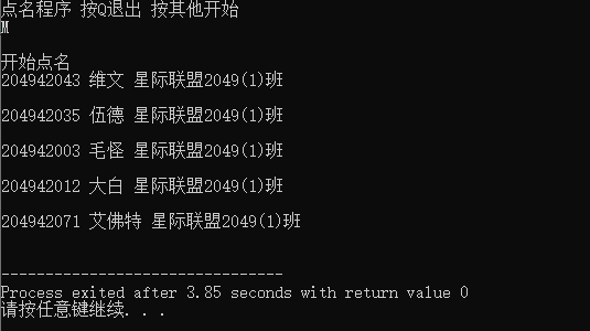 1 #define _CRT_SECURE_NO_WARNINGS 2 #define TOTAL 80 //学生人数 3 #define NUM 5 4 #include <stdlib.h> 5 #include <stdio.h> 6 #include <time.h> 7 void readFile(); 8 void saveFile(); 9 void Namedandsavefile(int num); 10 struct Student 11 { 12 int num; 13 char name[30]; 14 char clas[40]; 15 } stu[TOTAL]; //整个班级的学生信息数组 16 void readFile() 17 { 18 int i; 19 FILE* fp = fopen("list.txt", "rb"); 20 if (fp == NULL) 21 { 22 printf("打开文件失败\n"); 23 exit(1); 24 } 25 else 26 { 27 for ( i = 0; i < TOTAL; i++) 28 { 29 fscanf(fp, "%d %s %s\n", &stu[i].num, &stu[i].name, &stu[i].clas); 30 } 31 } 32 fclose(fp); 33 } 34 35 36 void Namedandsavefile(int num) 37 { 38 int id = -1,k=0,i=0; 39 int no[NUM]; 40 //配置随机数 41 srand((unsigned)time(NULL)); 42 43 printf("\n开始点名\n"); 44 //点名功能 45 46 for ( i = 0; i < 5; i++) 47 { 48 49 id = rand() % 80; 50 printf("%d %s %s\n",stu[id].num, stu[id].name, stu[id].clas); 51 printf("\n"); 52 no[i]=id; 53 } 54 55 FILE *fout; 56 57 fout=fopen("lucky.txt","w"); 58 59 if(!fout) 60 { 61 printf("fail to create txt\n"); 62 exit(0); 63 } 64 65 for (i = 0; i < NUM; i++) 66 fprintf(fout,"%d %s %s\n",stu[no[i]].num, stu[no[i]].name, stu[no[i]].clas); 67 68 69 fclose(fout); 70 71 72 } 73 int main() 74 { 75 int num = 0; 76 char c='\0'; 77 printf("点名程序 按Q退出 按其他开始 \n"); 78 if((c=getchar())!='Q') 79 { 80 81 readFile();//读取文件 82 Namedandsavefile(NUM); //点名函数并保存 83 } 84 else 85 exit(1); 86 87 return 0; 88 }