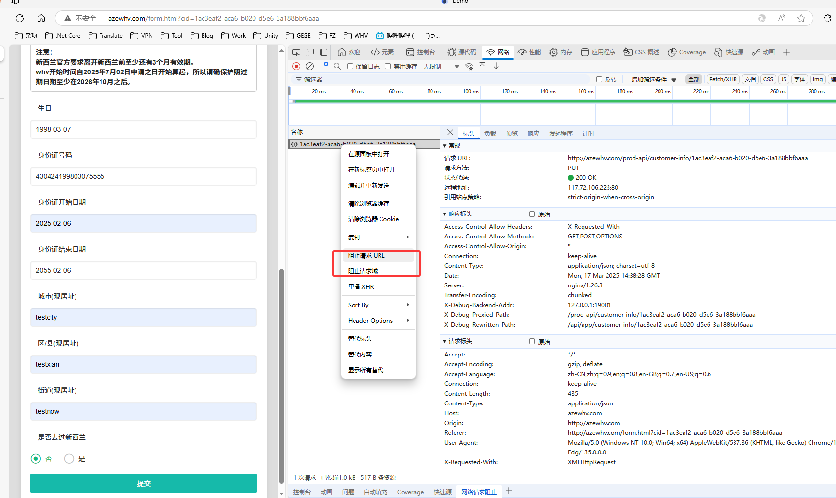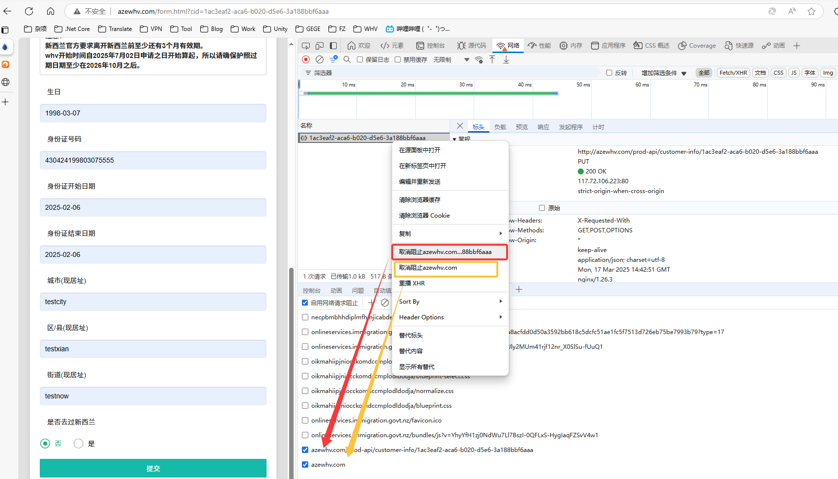 在浏览器中F12,网络请求中选中要Debug的接口的网请求,右键 --> 阻止请求URL/阻止请求域