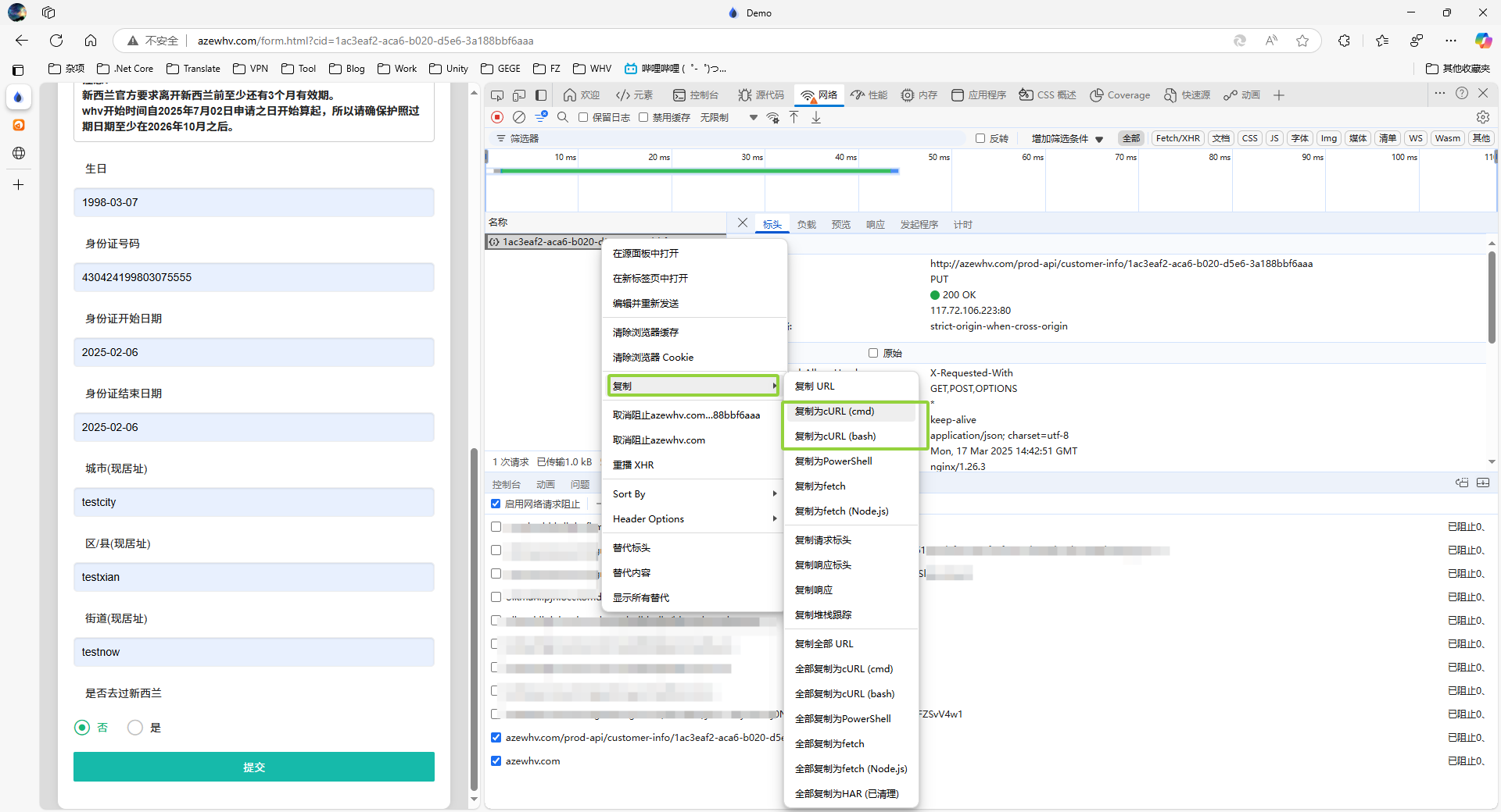选中将对应请求的网络请求,右键——》 复制——》 复制为 cURL