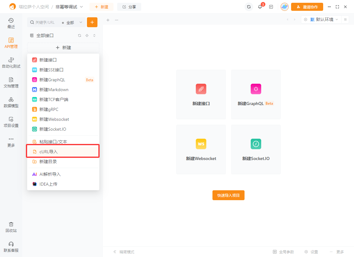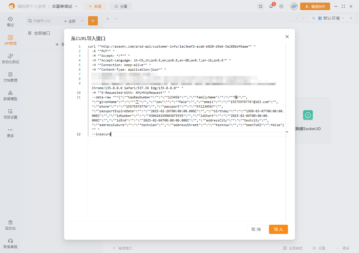 打开Api Post , 或者PostMan 都行, 去新建或导入curl