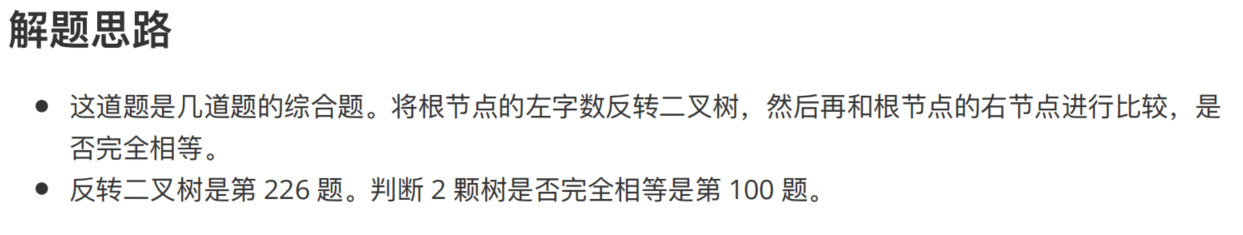 此题就是考的细,原理上不难,还是递归,那么遍历顺序是啥,答案就是后序遍历,有人结合代码看可能不理解,觉得这明明是前序遍历啊,先判断节点,再对左右节点进行递归。这是一个误导,还有就是这次写的代码可读性比较差,那么为啥是后序遍历呢,因为他是先递归然后再判断是否相等。所以是后续遍历。反正核心思想就是:比较外侧是否相等,在比较内称是否相等,都相等就对称。