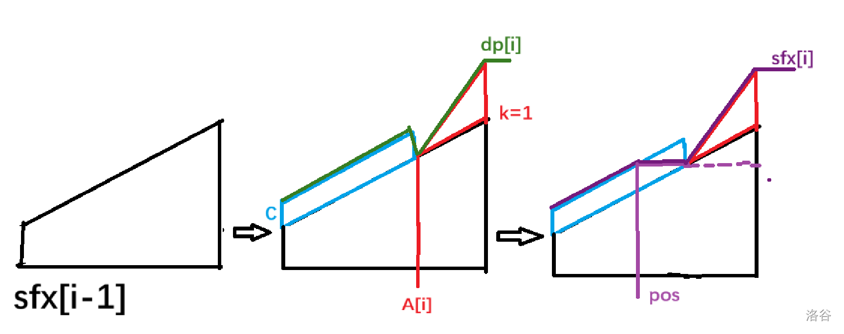 考虑一下我们在线段树上要干些什么。推一下可以发现:我们每一轮更新首先是在 \(sfx\) 数组上,以 \(a_i\) 为界,\([0,a_i)\) 上面我们区间加一个常量 \(C\)(对应原题中“老师会不高兴”这部分),\([a_i,N]\) 部分我们加一个首项为 \(0\),公差为 \(1\) 的等差数列(对应原题中“选手会不高兴”这部分)。这个时候其实我们得到的就是整个 \(dp_i\) 数组;然后我们对它做一遍后缀和,以得到下次转移的基础。不妨画个图直观理解: