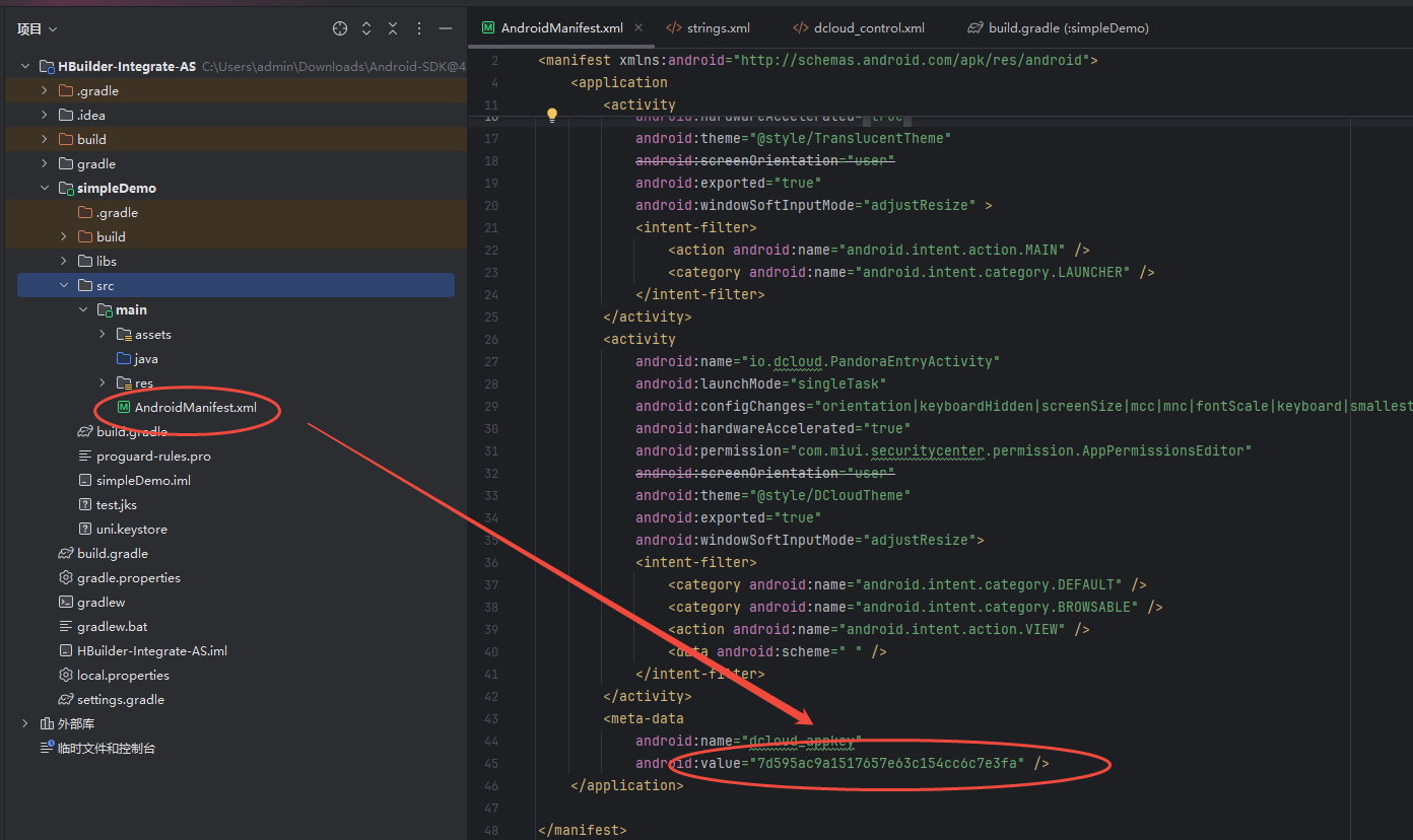 配置AppKey:文件路径(HBuilder-Integrate-AS\simpleDemo\src\main\AndroidManifest.xml)