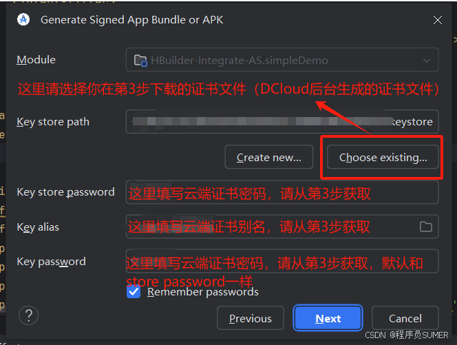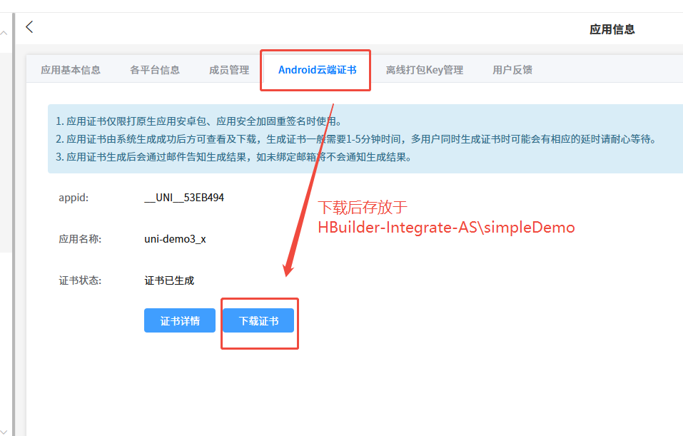 证书获取方式:开发者中心进行获取,下载后存放于(HBuilder-Integrate-AS\simpleDemo)目录