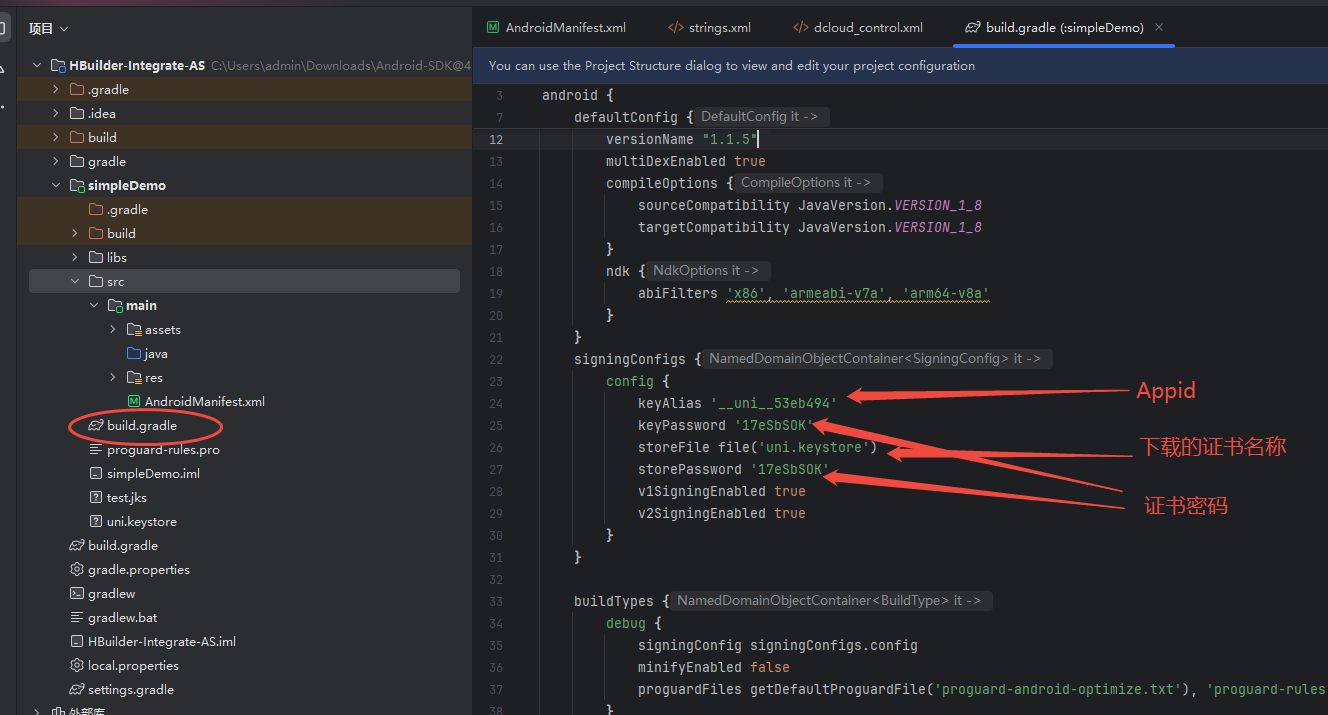 配置方式:文件路径(HBuilder-Integrate-AS\simpleDemo\build.gradle),将下载后的证书文件名,证书密码,应用id填入