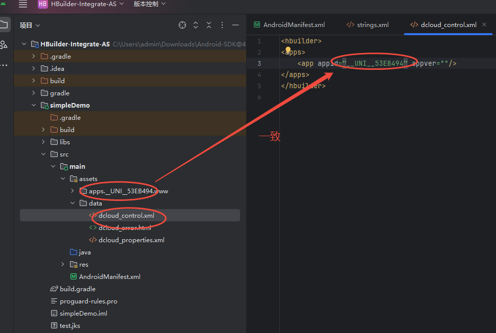 - 配置引入:将当前资源目录名称填入配置文件文件路径(HBuilder-Integrate-AS\simpleDemo\src\main\assets\data\dcloud_control.xml)