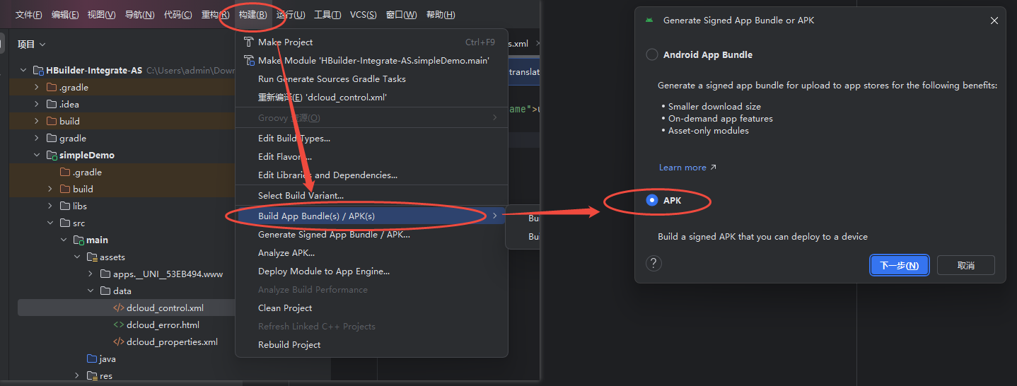 - 选择 构建 -> 打包apk -> apk