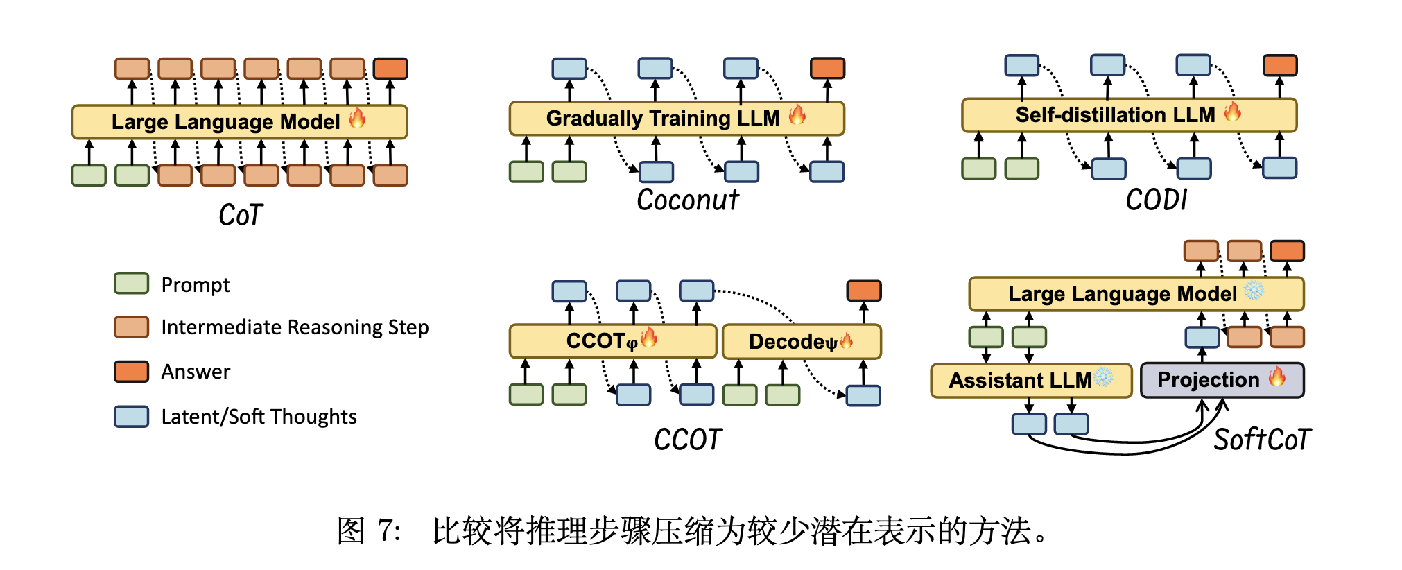 其核心思想是将冗长的文字版推理步骤(CoT)压缩成更紧凑的“潜在表示”(Latent Representations),即在模型的“隐藏思考空间”中进行推理,而不是完全依赖显式的文字输出。通常这些方法可以分为两类:训练 LLMs 使用潜在表示进行推理或使用辅助模型。