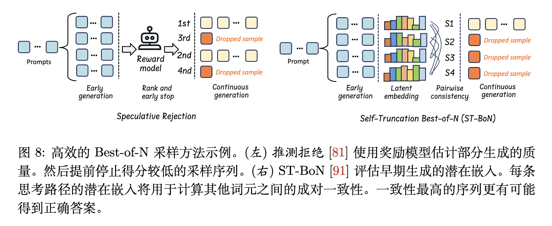 Speculative Rejection通过奖励模型提前终止低质量推理路径;或ST-BoN利用嵌入一致性选择最优路径,其核心思想是。