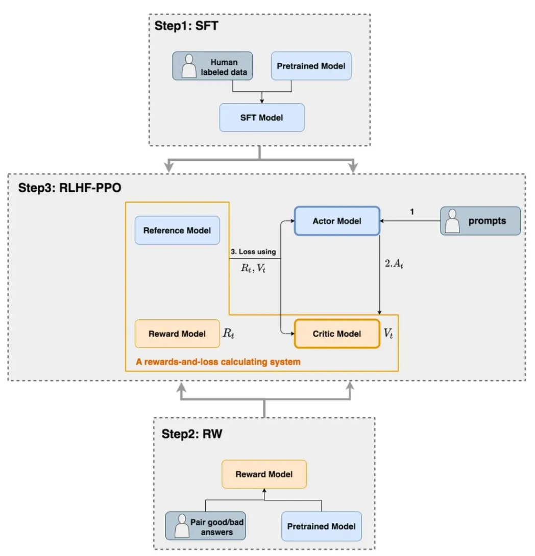 RLHF(基于人类反馈的强化学习) 过程中,LLM 一般先进行 SFT 监督微调(Step 1),再进行 RL 强化学习微调(Step 2,3)