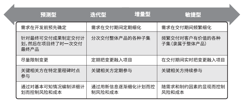 ▶ 混合型生命周期:属于预测型生命周期和适应型生命周期的结合。充分了解或有确定需求的项目要素遵循预测型开发生命周期,而仍在发展中的要素遵循适应型开发生命周期。