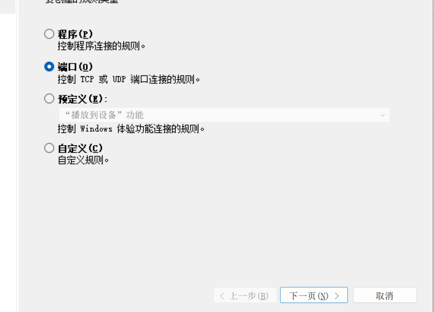 打开你的控制面板 选防火墙 然后选左侧高级设置 然后选择入站规则 点击新建规则 点击端口 然后下一页