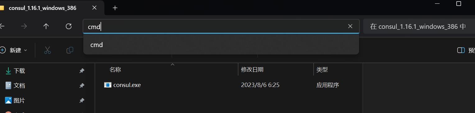 然后找到你安装的consul.exe 不用打开 在路径上输入cmd敲回车