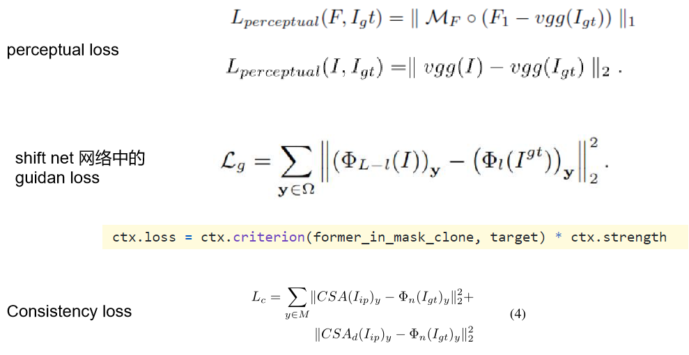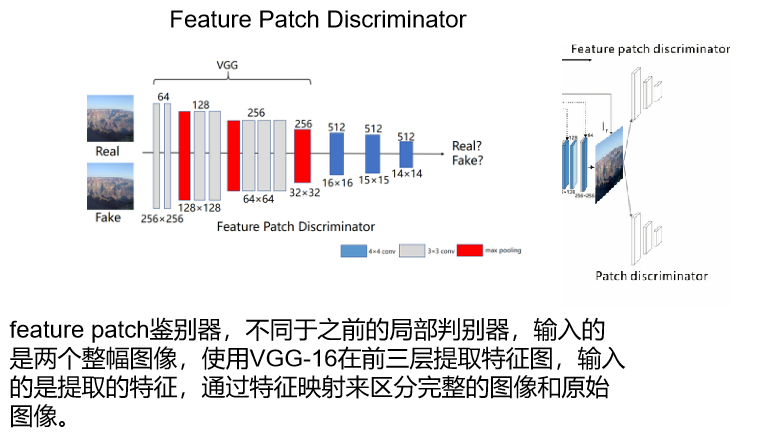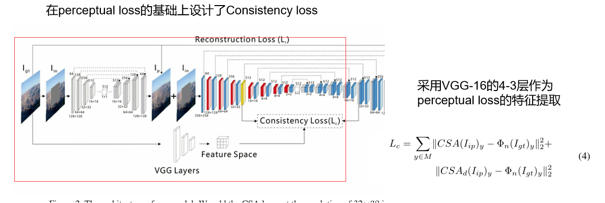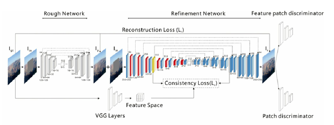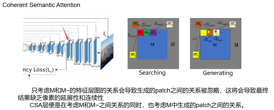 首先在粗修复阶段,输入I_in到粗修复网络得到I_p。 然后带有CSA层的细修复网络将I_p、I_in作为输入,得到最后的结果I_r。 最后patch和feature patch判别器共同工作得到高分辨率的Ir。