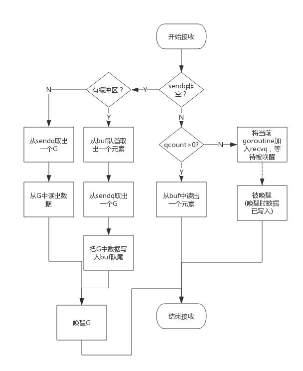- 如果等待发送队列sendq不为空,且没有缓冲区,直接从sendq中取出G,把G中数据读出,最后把G唤醒,结束读取过程;
