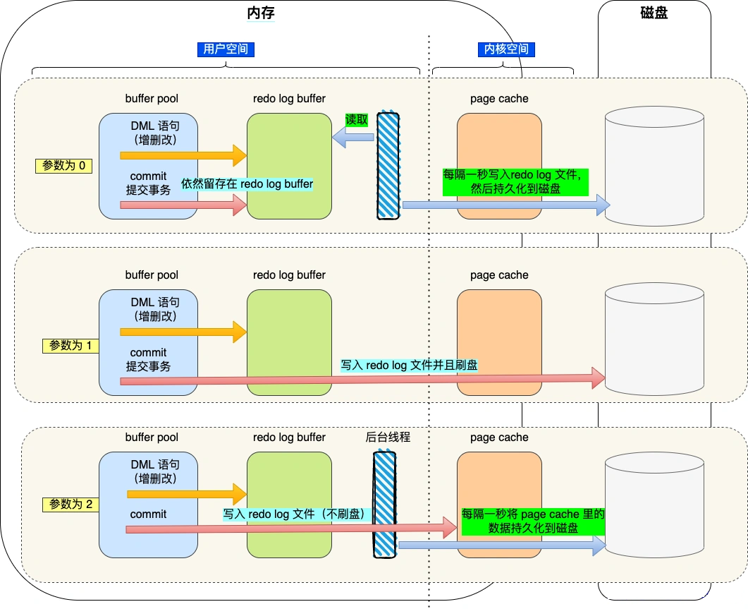 - MySQL 提供一个 innodb_flush_log_at_trx_commit 参数来控制: