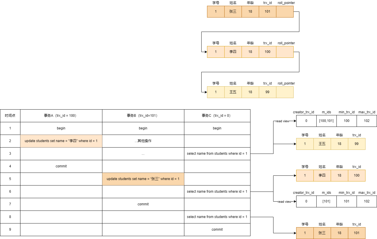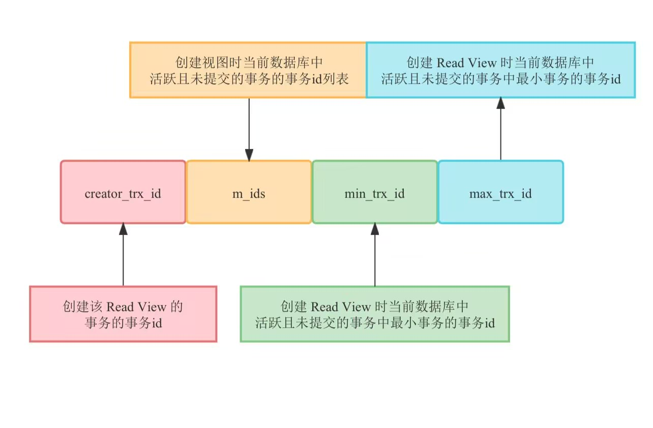 - 如果m_ids不包含 trx_id ,则说明你这个事务在 Read View 生成之前就已经提交了,修改的结果,当前事务是能看见的。