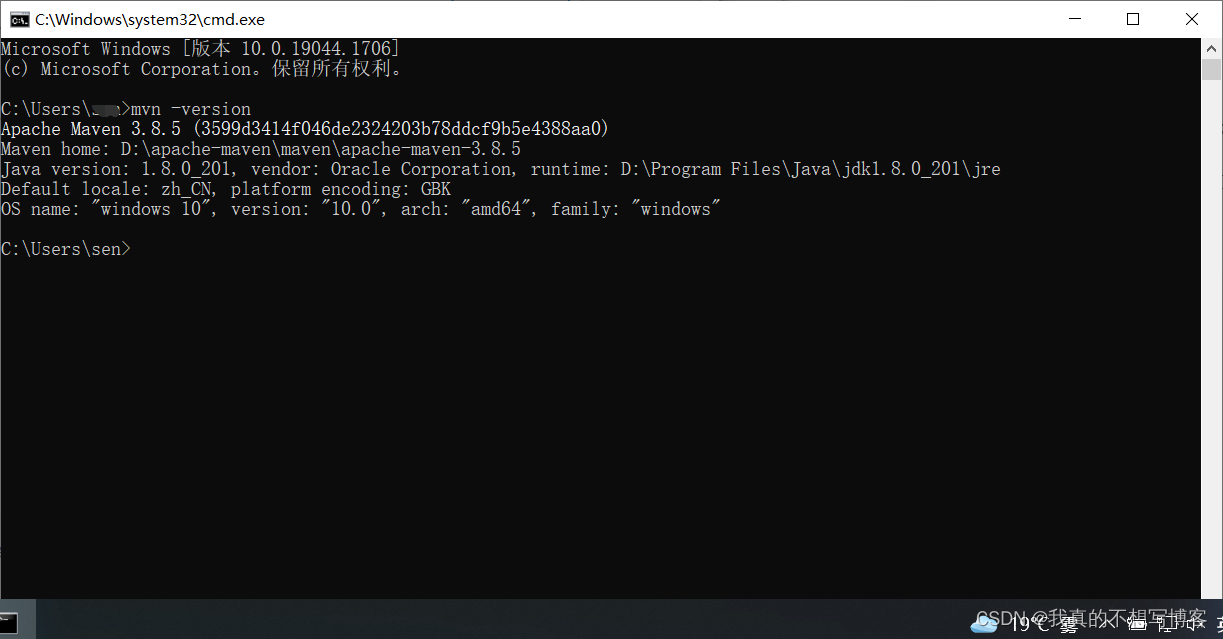 win+r,输入cmd,回车运行,然后输入mvn -version,显示下面的信息就说明配置成功了