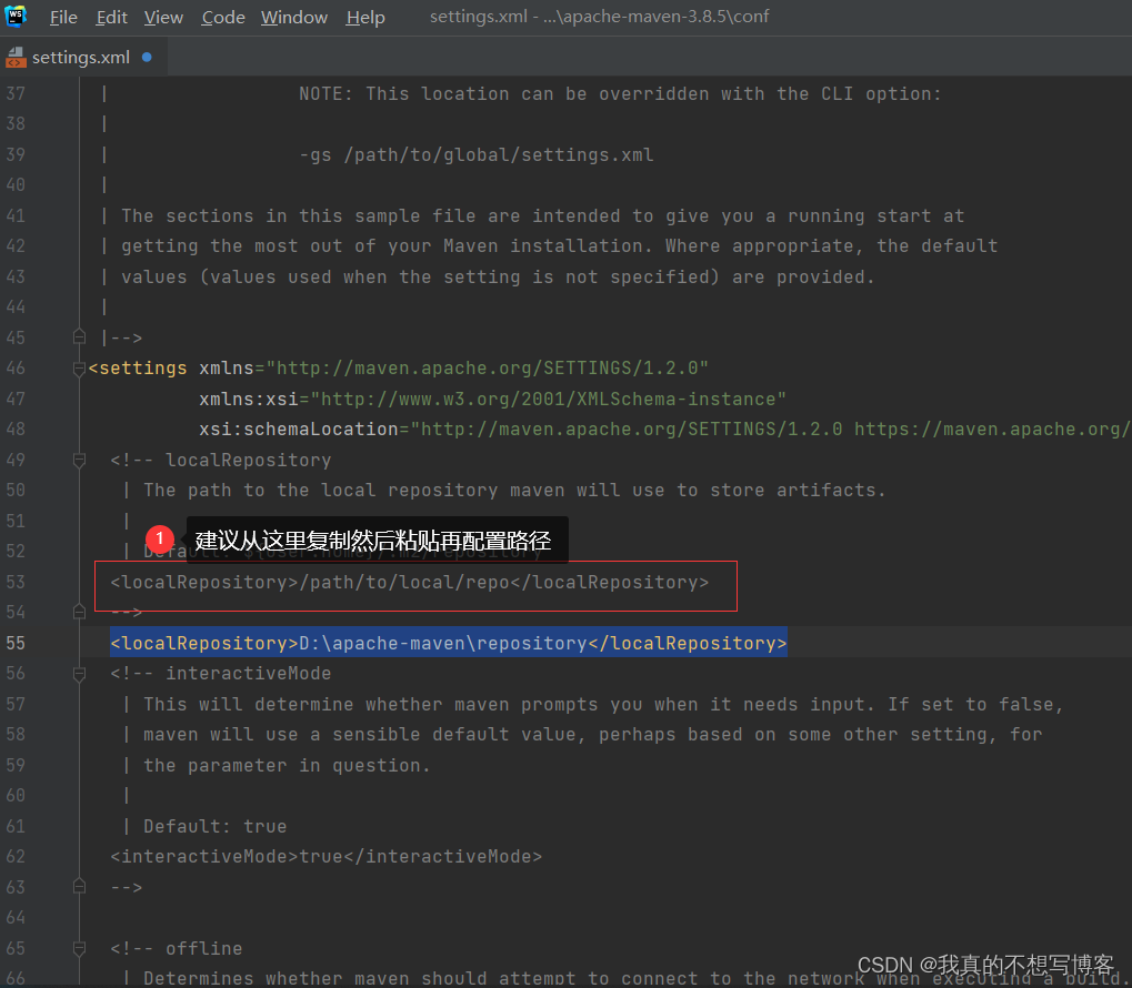 打开conf下面的settings.xml文件找到localRepository标签,在注释的外面添加如下信息,里面的路径自己定义,需要新建repository文件夹,一般都是命名为这个名字,也可以是其他的名字,不过不建议