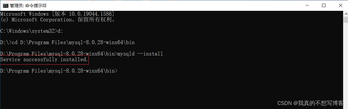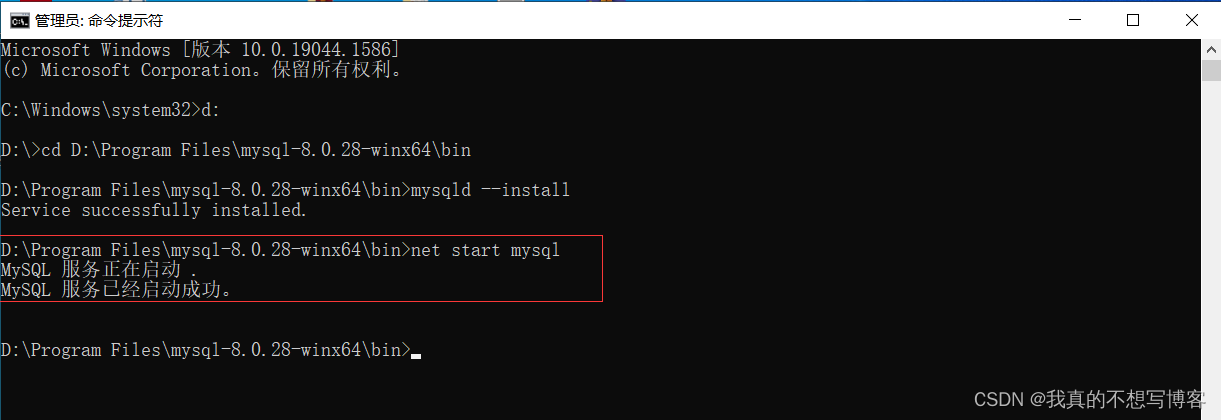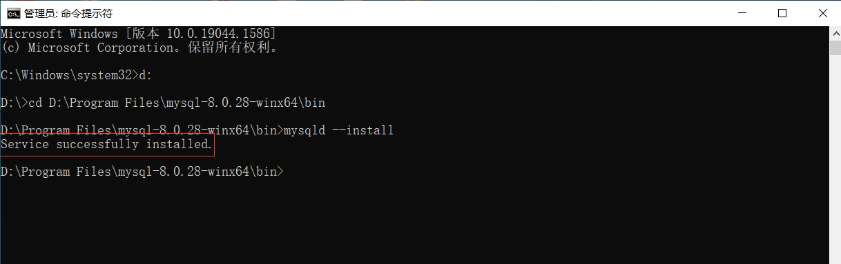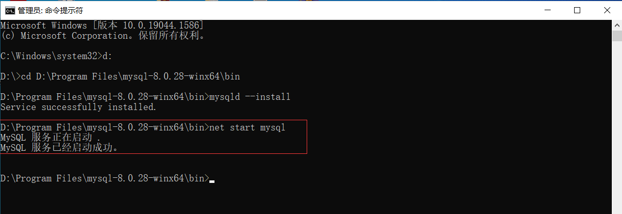 2、出现Service successfully installed.(服务成功安装)即表示服务安装成功,然后启动服务就行了,启动服务命令:net start mysql