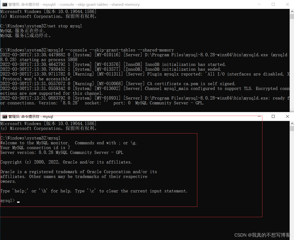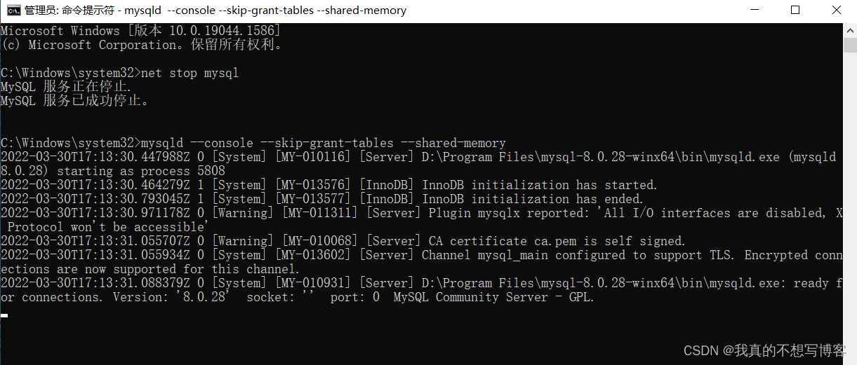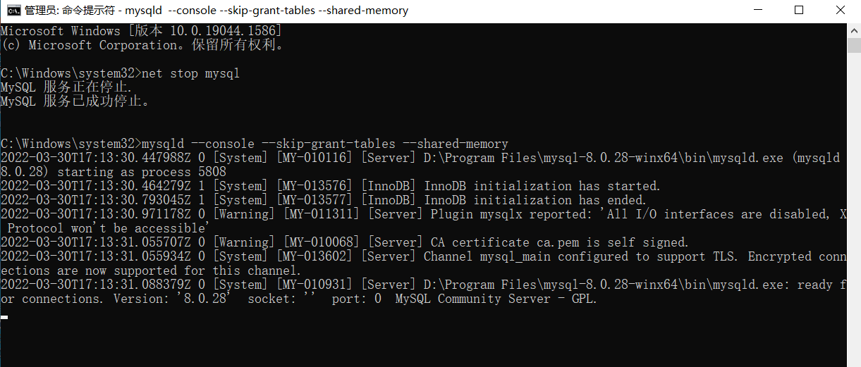 2、运行mysqld --console --skip-grant-tables --shared-memory命令,利用管理员权限跳过权限表验证,出现如下提示,进入等待环节