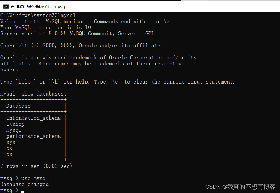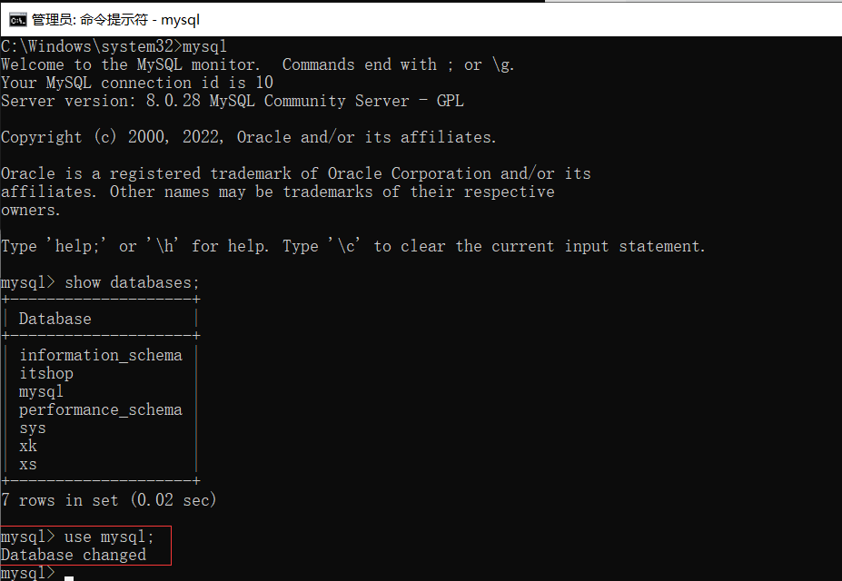 首先输入use mysql;命令,出现Database changed(数据库已更改),进入下一步