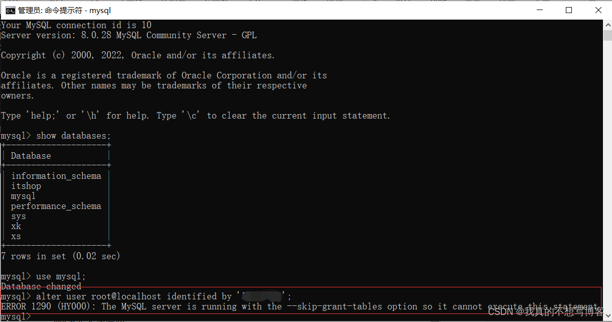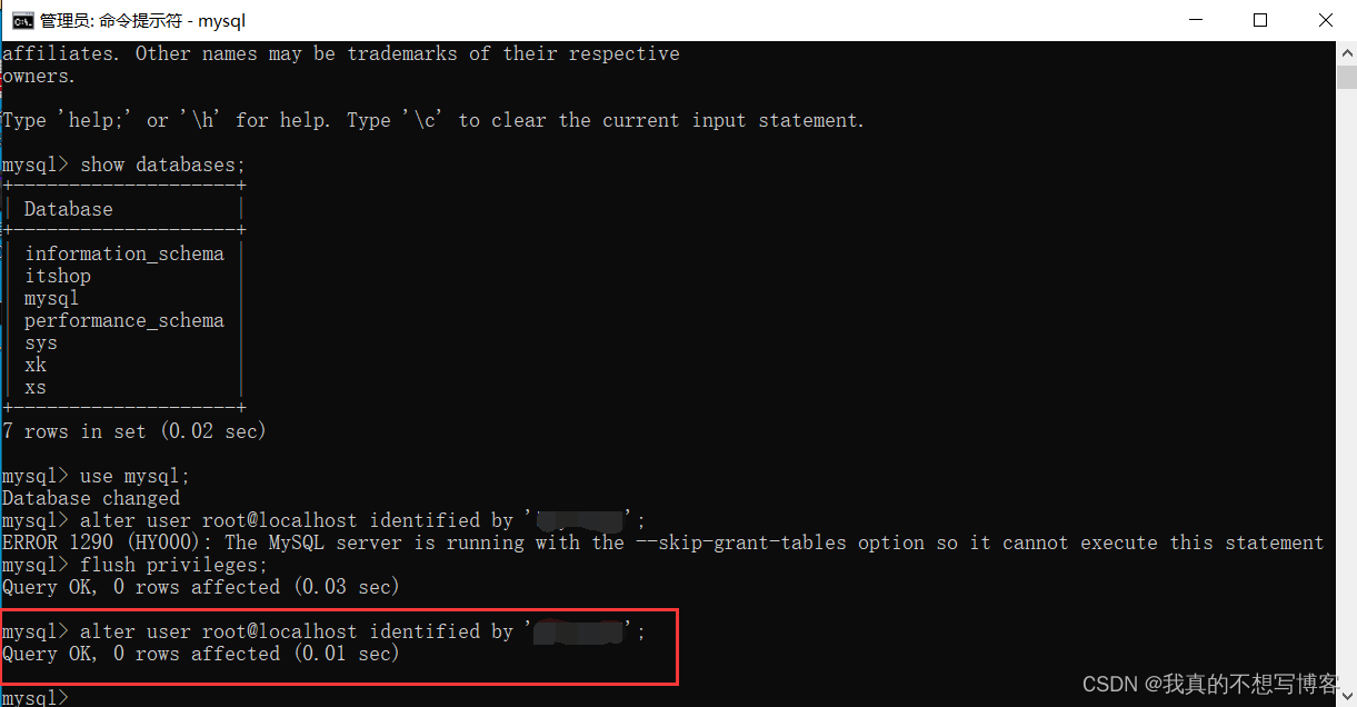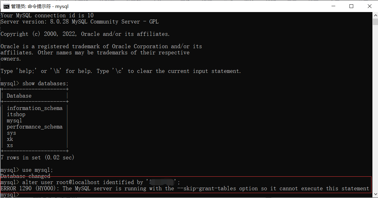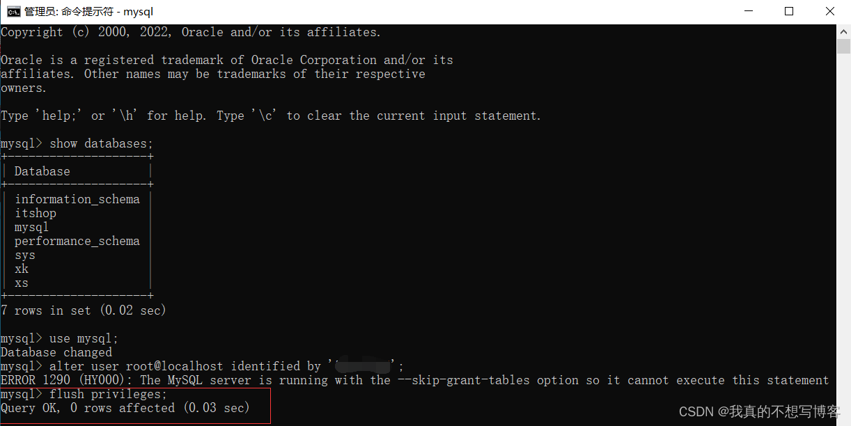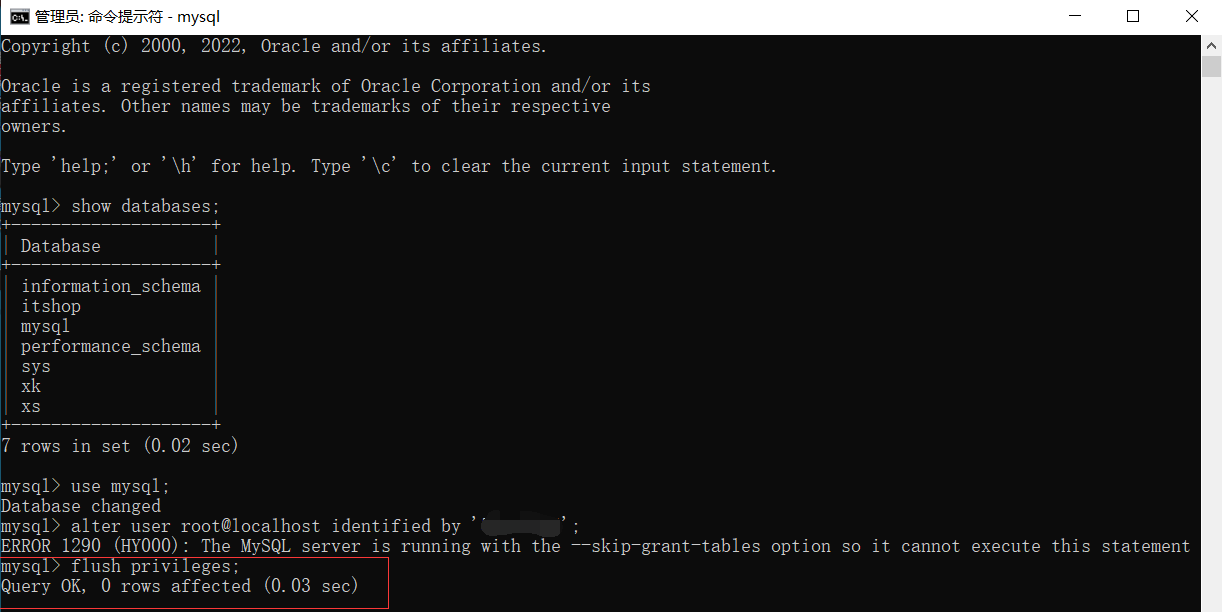 这里出现了报错不要慌,更新一下权限就可以了,输入flush privileges;命令更新权限