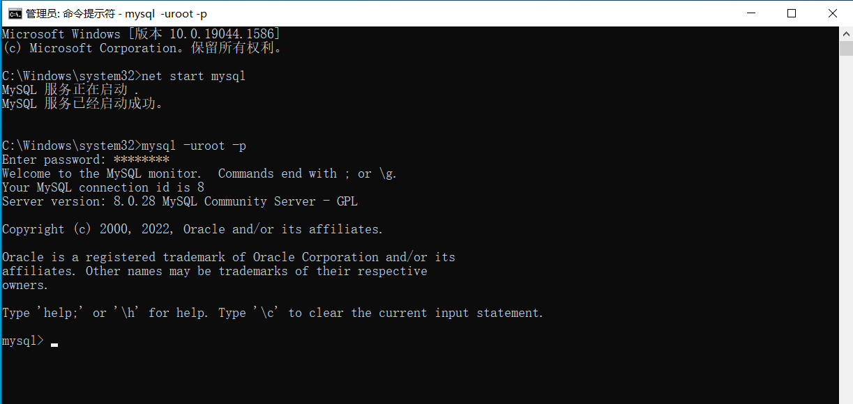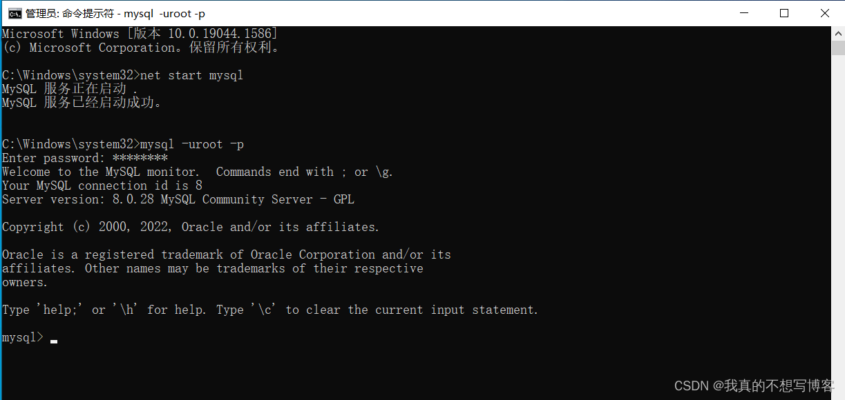 这样就更改成功,然后退出并关闭这两个cmd,重新运行一个cmd,启动数据库并登录数据库确认更改密码成功没。出现下面这些提示就说明成功了