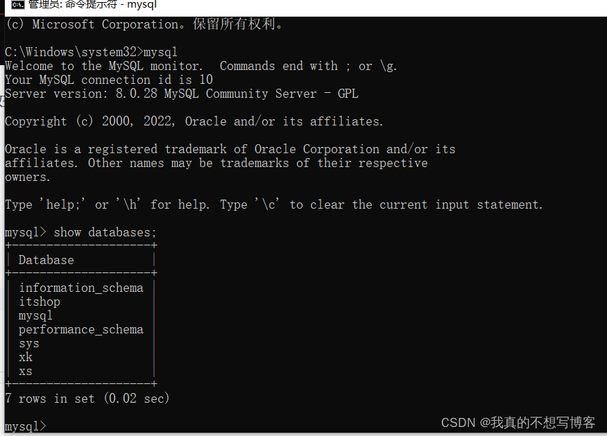 然后在新打开的cmd里面输入mysql,这是不需要用户名和密码就可以连接到MySQL数据库了