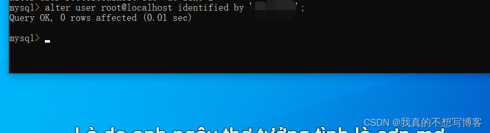 登录进去后输入这个命令alter user root@localhost identified by '';去改密码,出现下面这些信息说明你改密成功了