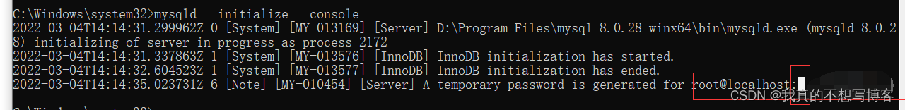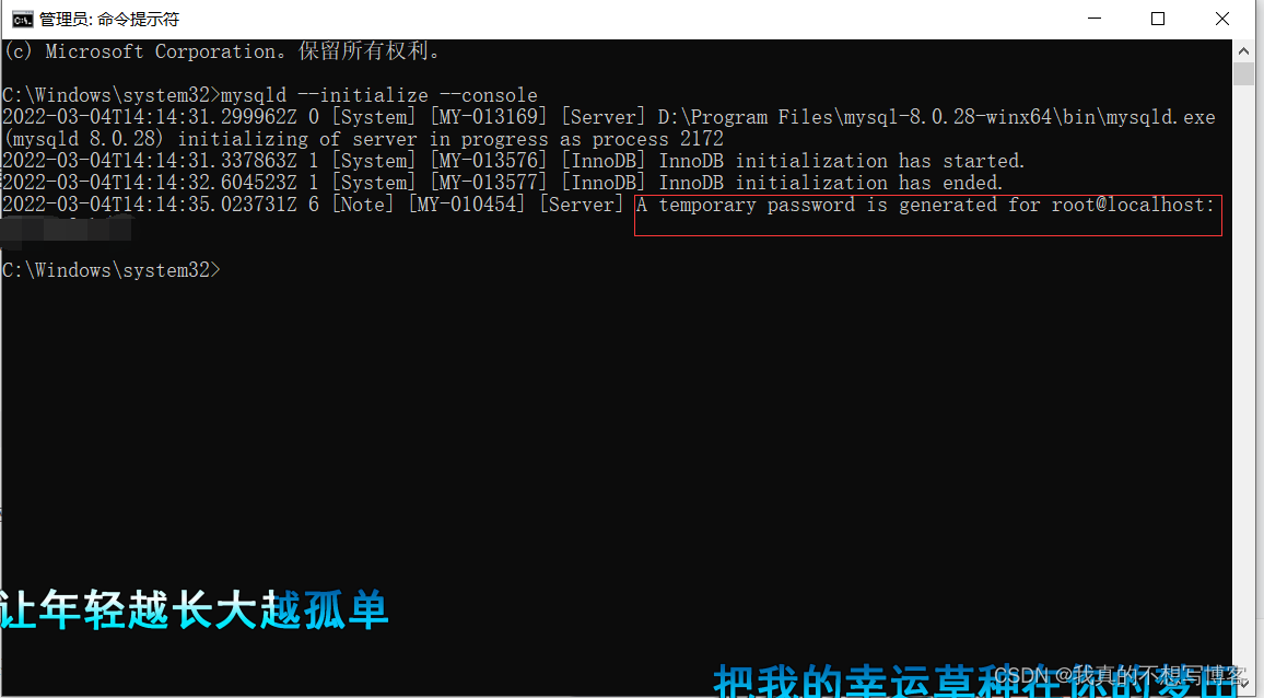 然后用管理员身份运行cmd,输入mysqld --initialize --console这个命令,然后就会出现如下信息