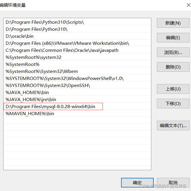 然后选择环境变量,在系统变量里面找到path变量,双击进去;然后在空白行双击,再把MySQL的bin目录复制进去